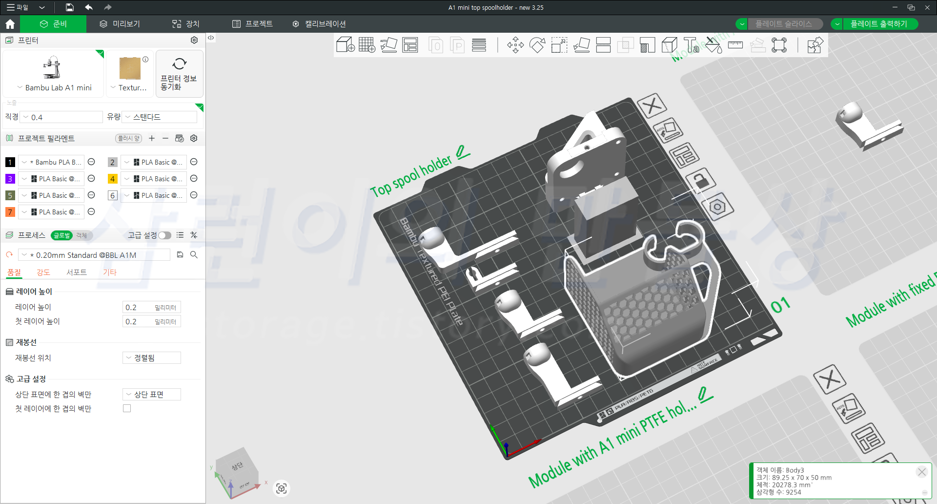 Bambu Studio는 정말 정말 편하게 잘 만들어져있습니다. 처음 사용해본 저에겐 '이렇게 편하다고?' 라는 생각이 들 정도입니다. 뱀부랩 제품에 즉시 사용 가능한 3D모델 데이터는 "메이커월드(https://makerworld.com/ko)"에서 구할 수 있습니다. 여기서 찾은 뱀부랩 A1 mini용 도구 보관함을 출력하기 위한 준비 모습입니다.