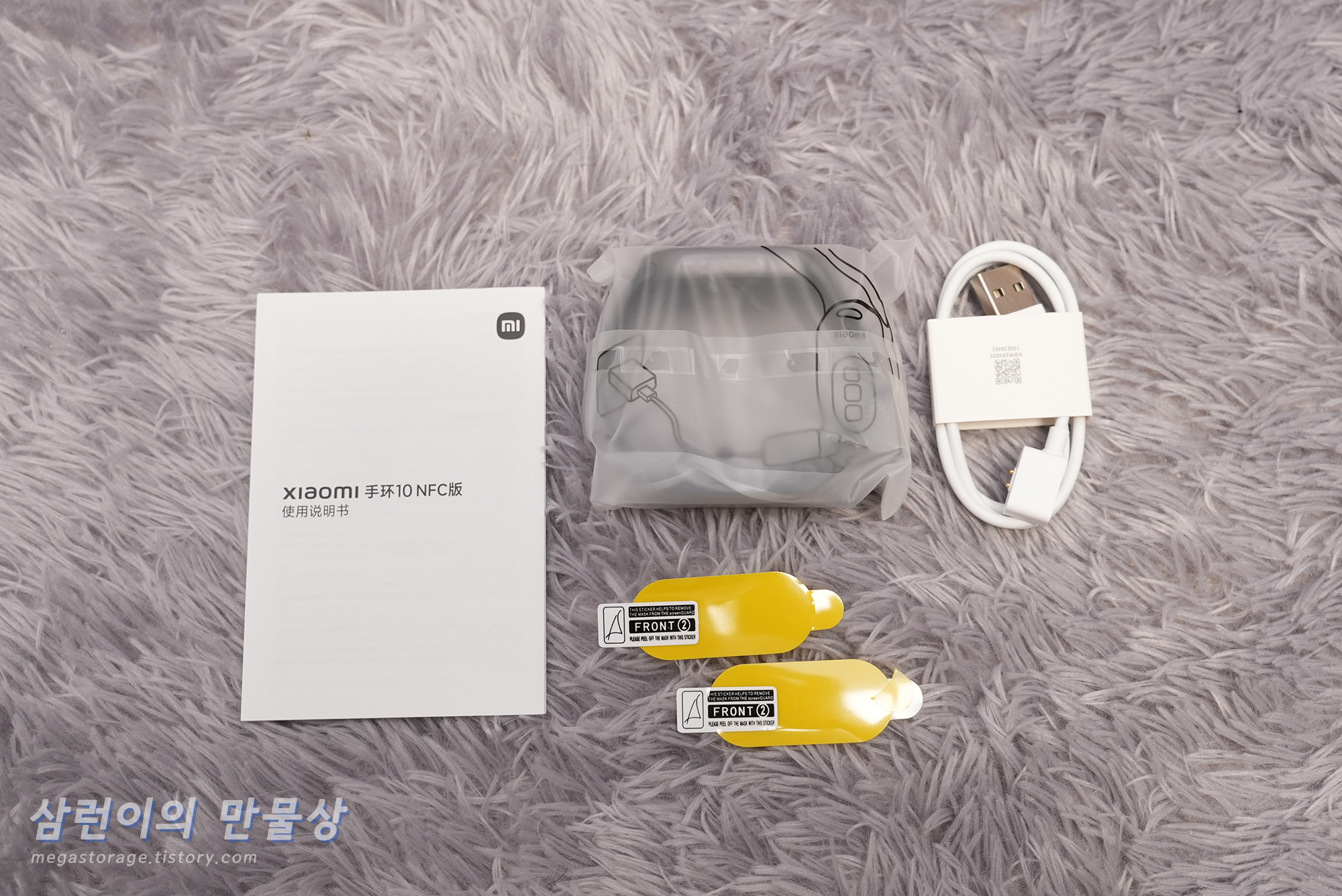 전체 구성품은 위 사진과 같이 매뉴얼, 샤오미 미밴드 10 NFC, 충전 케이블이며 판매자가 사은품으로 동봉한 보호필름 2장이 있습니다.