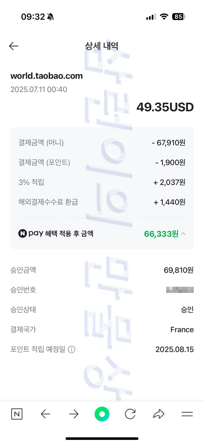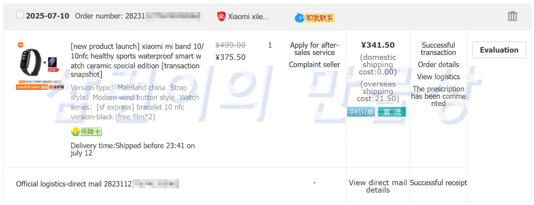 타오바오에서 해외 직배송비 포함 341.5위안에 구입했습니다. 네이버페이 머니카드로 달러 결제했으며, 최종 지출은 66,333원 입니다. 참고로 샤오미 미밴드 10의 국내 정식 출시가는 59,800원입니다. NFC 기능 하나 때문에 추가금 좀 더 주고 구입한 것이 되었습니다.