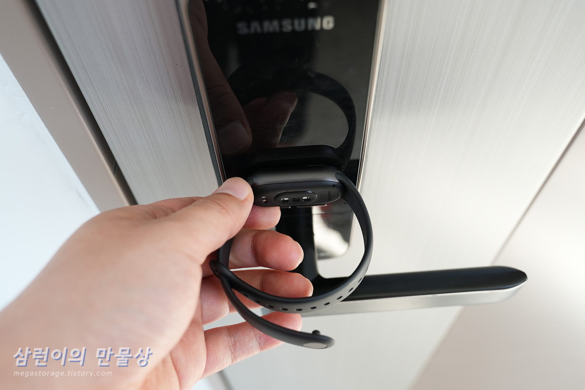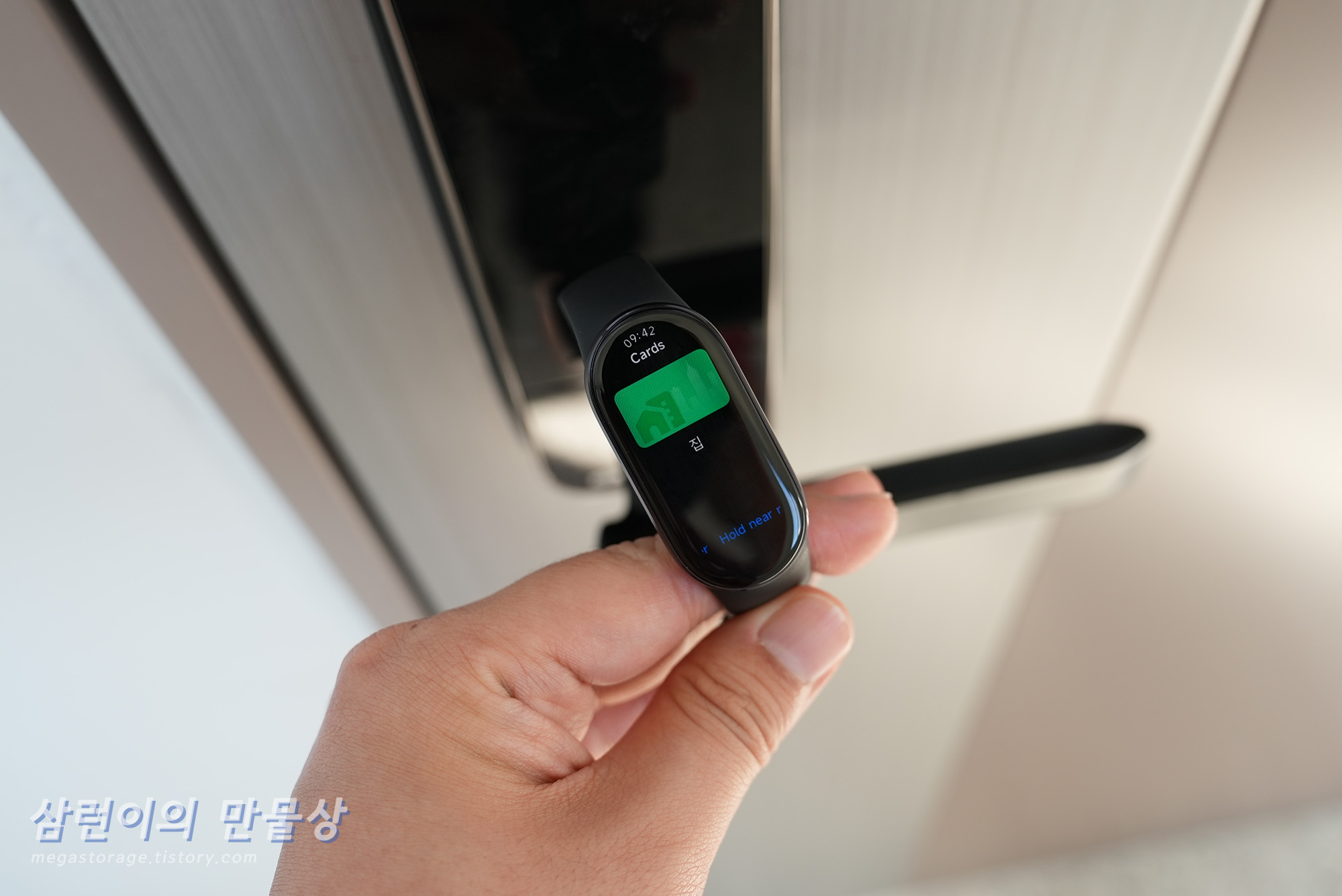도어락을 깨운 후 샤오미 미밴드 10을 가져다 대면? 1초 안에 바로 열립니다.
