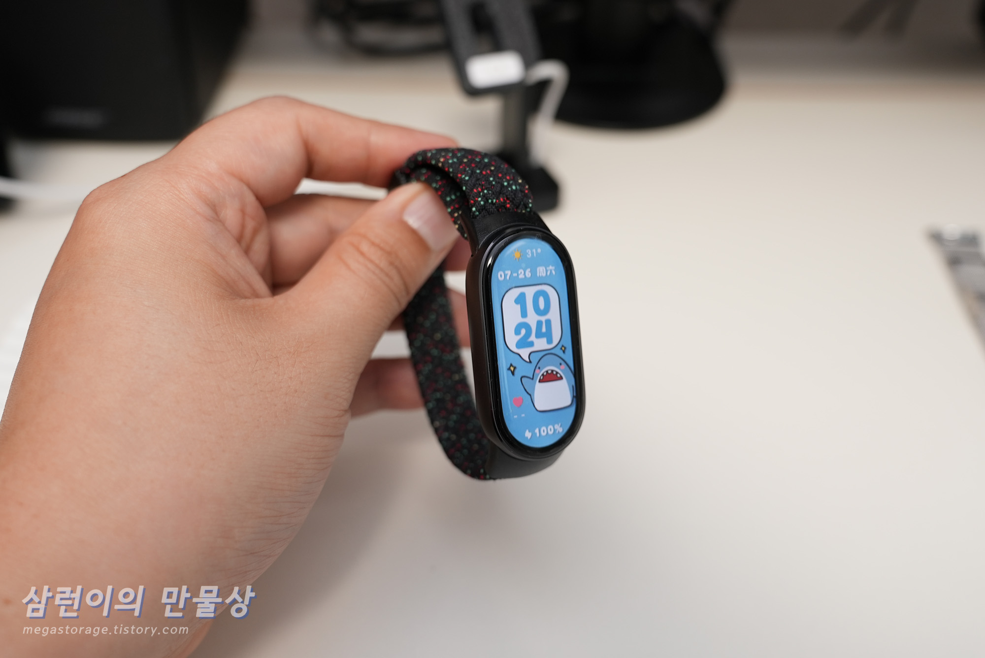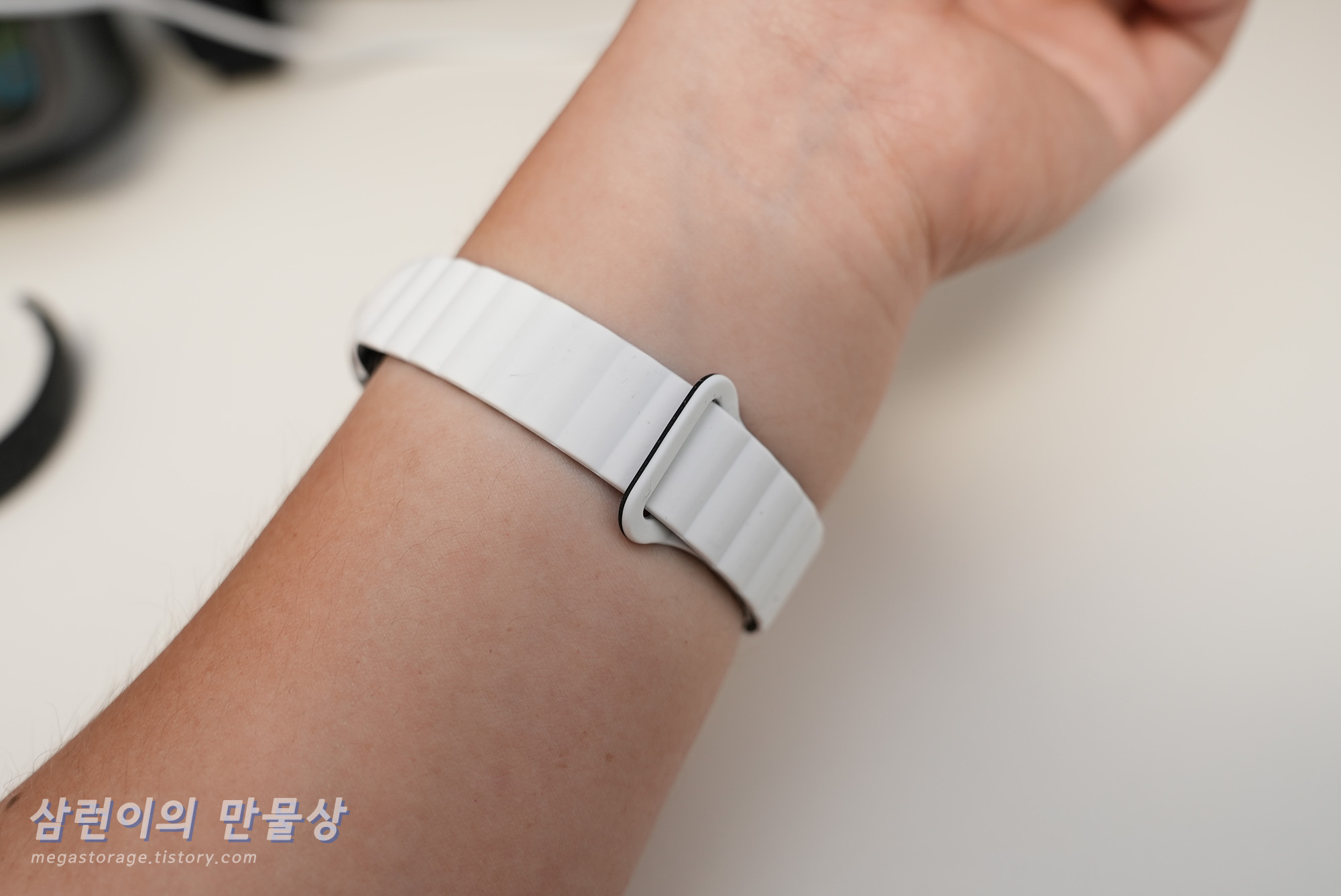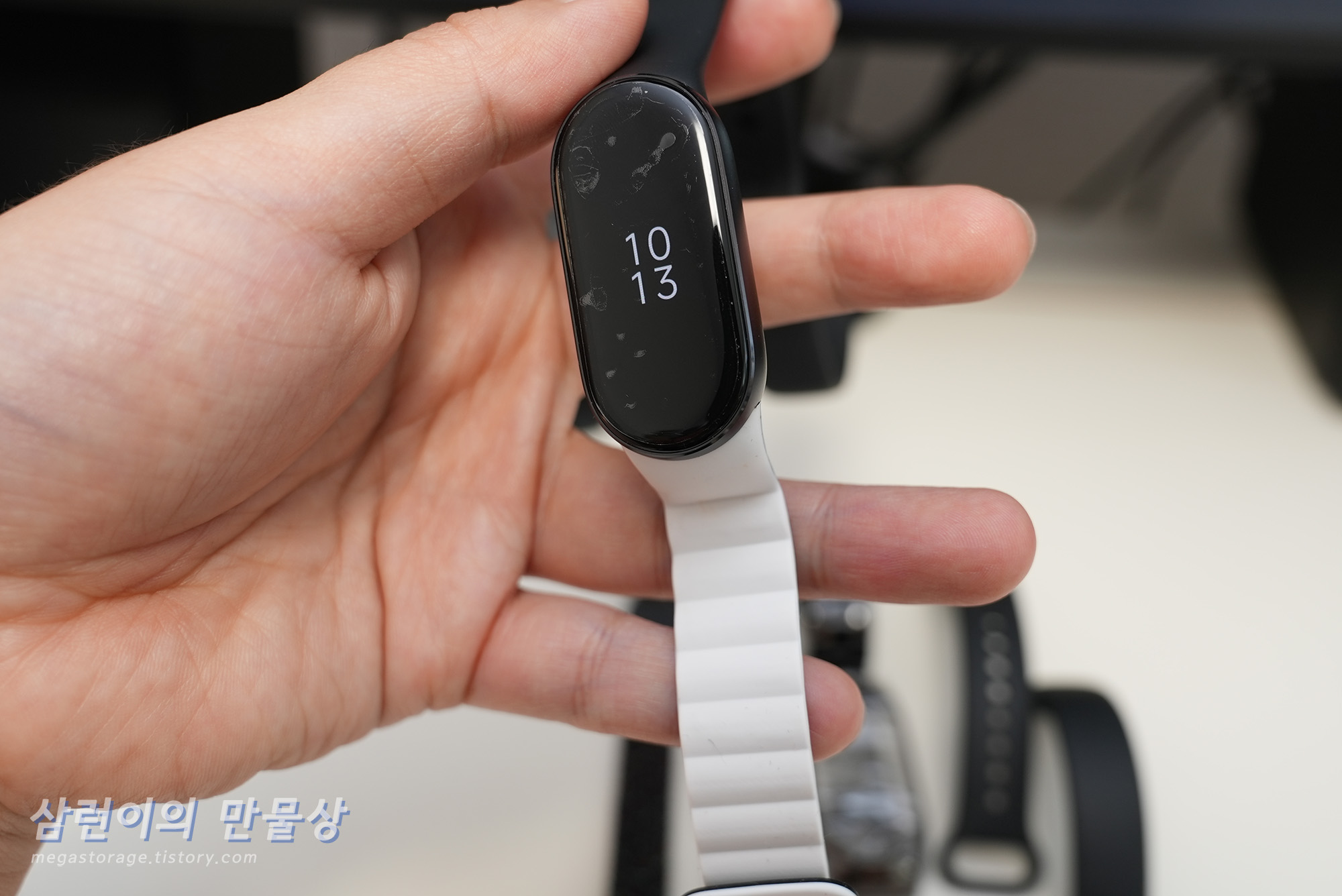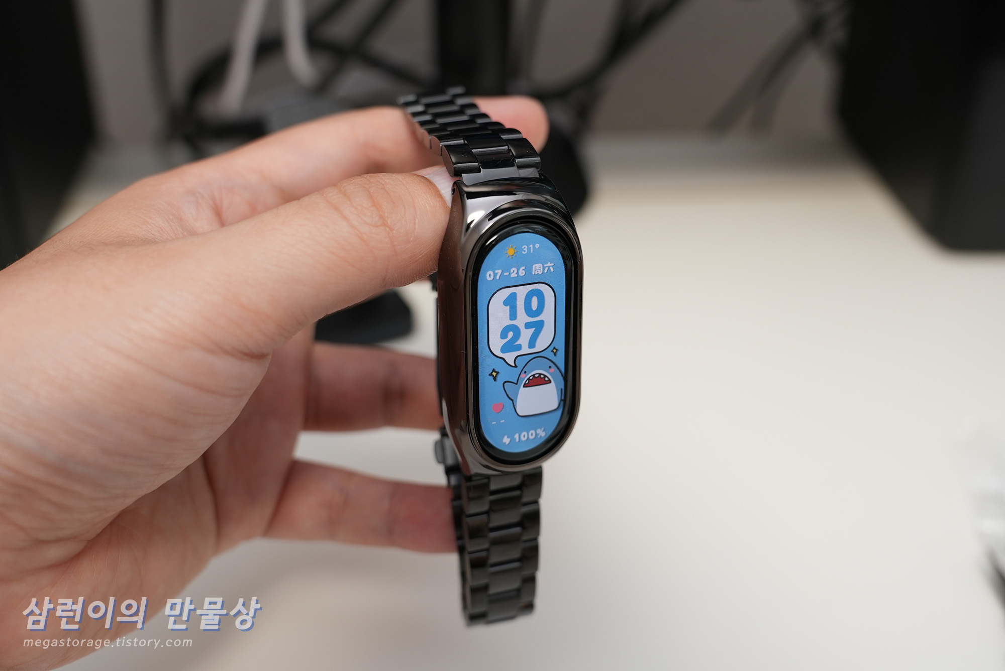 이건 이상하게도 사이즈가 안 맞더라구요. 애매하게 장착되는 느낌이었습니다. 워치 위아래로 끼우는 스트랩은 문제 없으나, 위 사진처럼 워치를 둘러싸는 형태는 샤오미 미밴드 10과 호환되는 스트랩을 써야 깔끔할 것으로 생각됩니다.