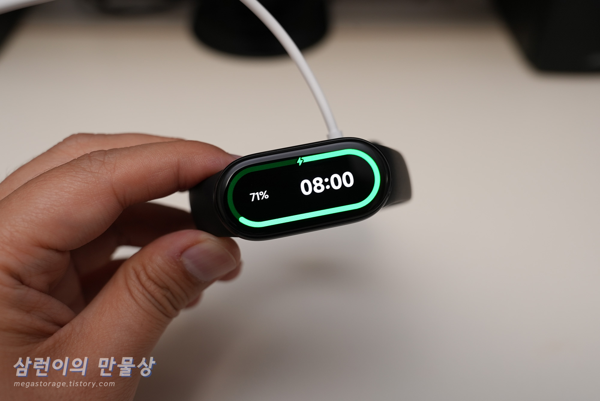 샤오미 미밴드 시리즈는 전원이 꺼져있는 상태에서 충전 케이블 연결 시 전원이 켜지는 방식입니다. 기본 약 70% 충전된 상태였습니다.