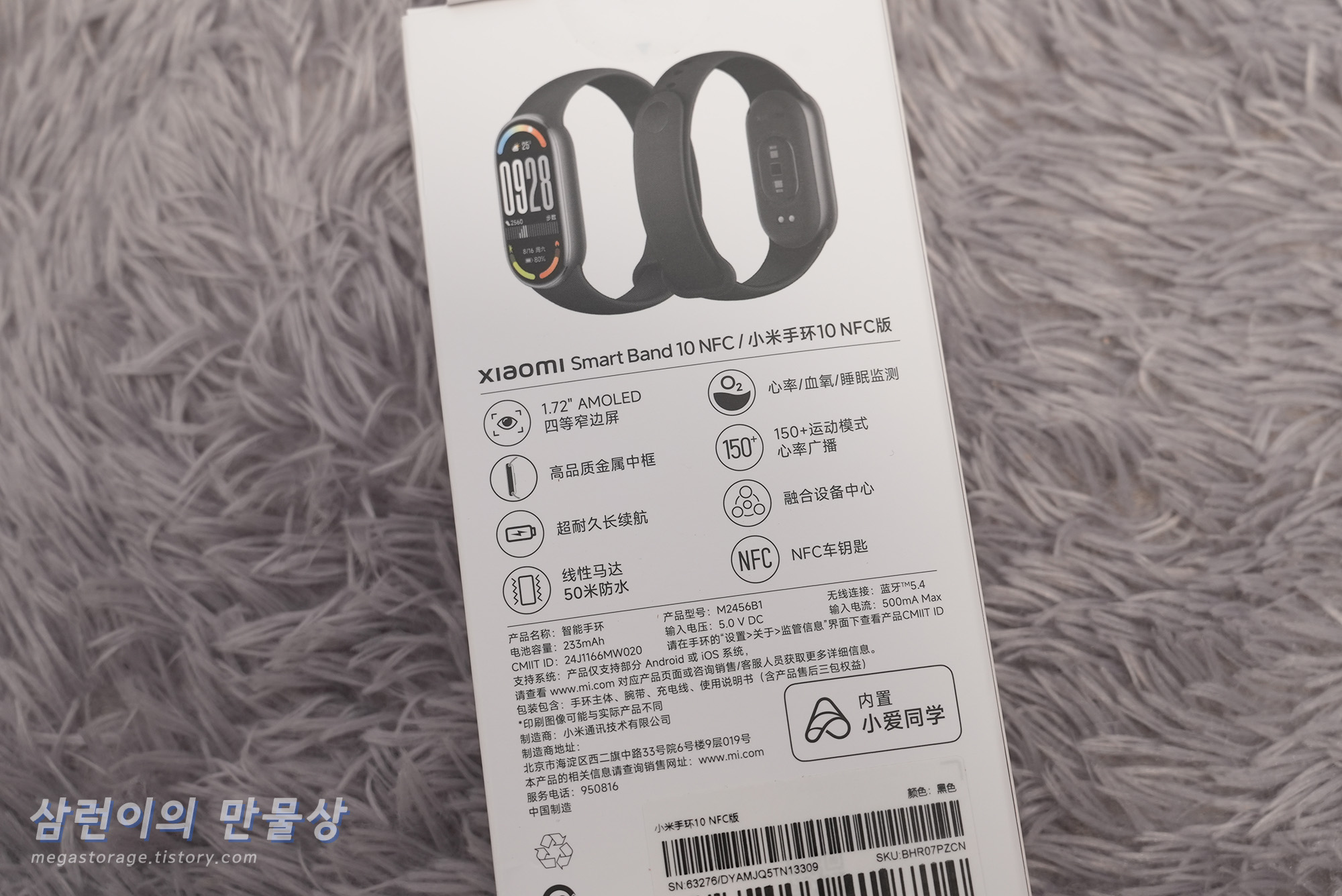 샤오미 미밴드 10 NFC 모델의 박스 후면에는 간단한 스펙이 중국어로 적혀있습니다. 중국 내수품이라서 중국어로 적혀있네요.