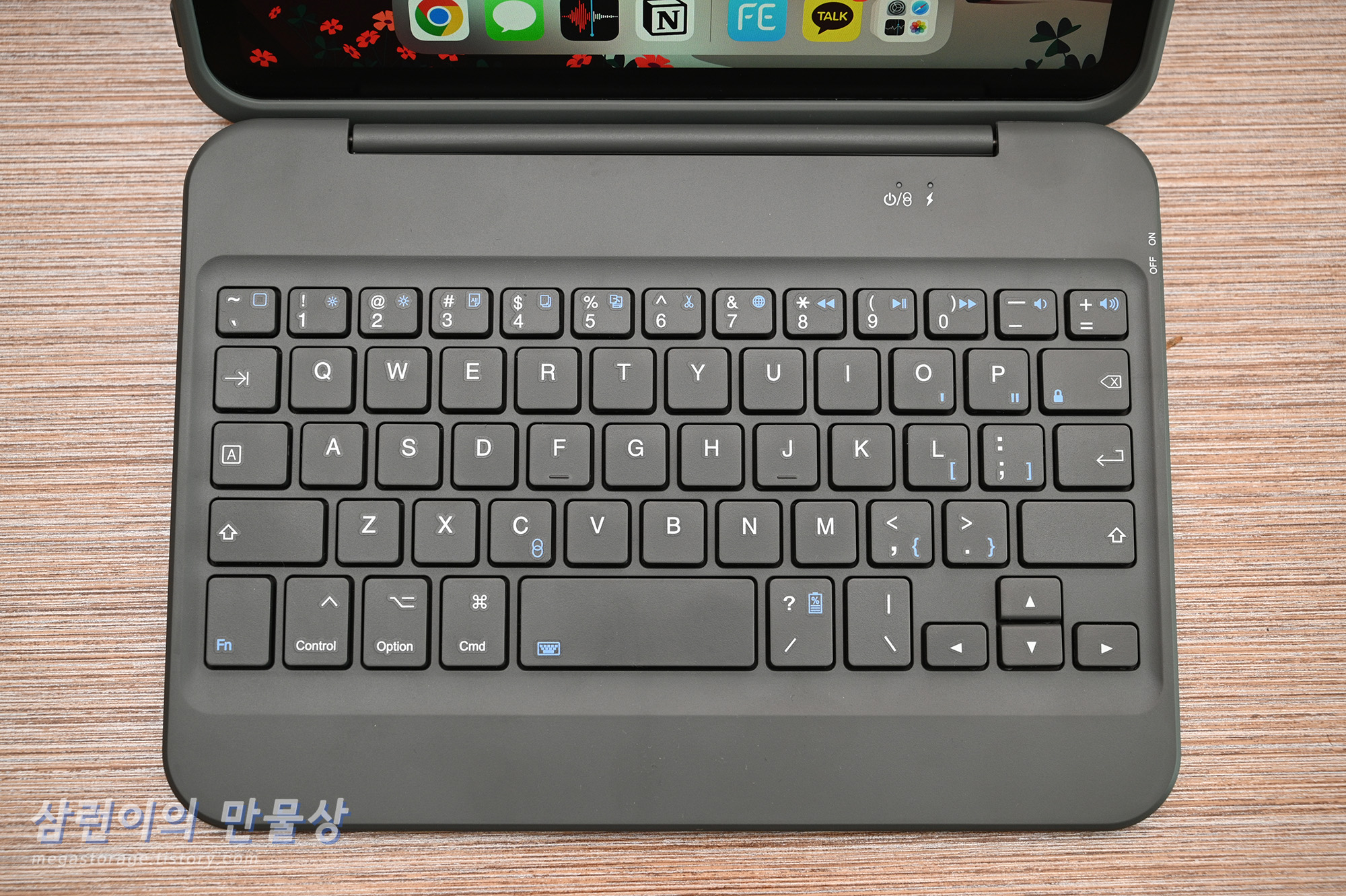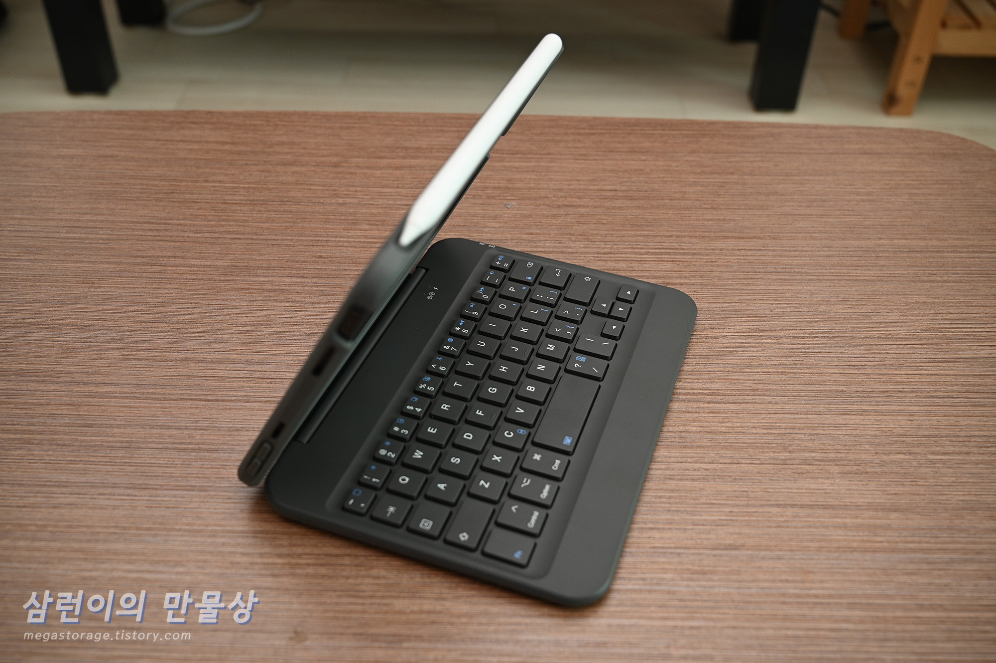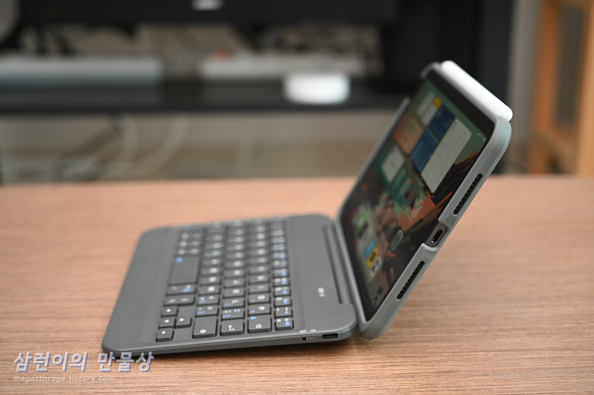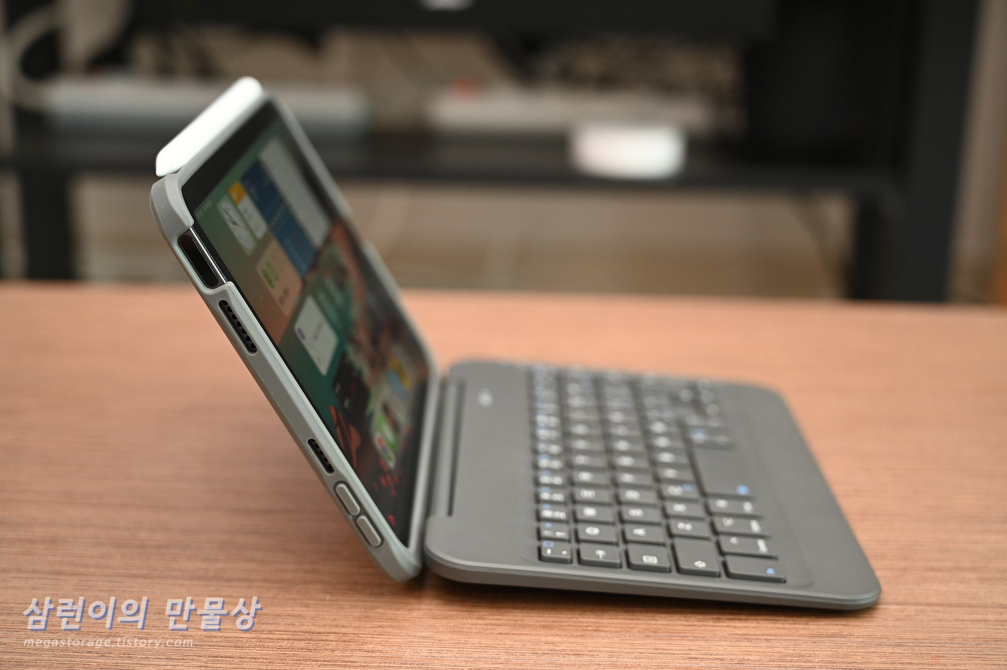 아이패드 미니6를 끼운 모습은 위 사진과 같습니다. 멀리서 보면 아주 작은 노트북 같은 느낌입니다.